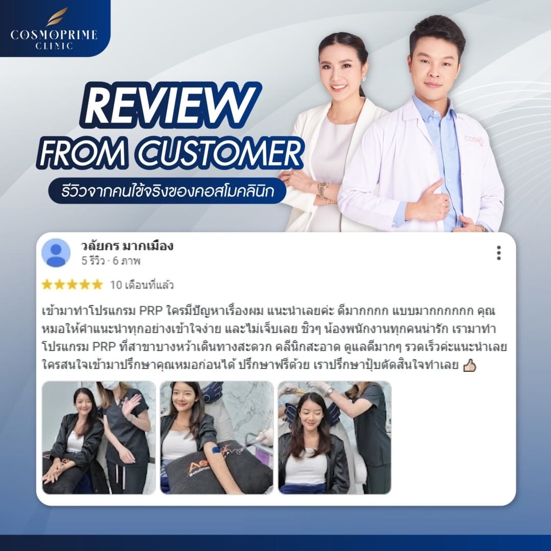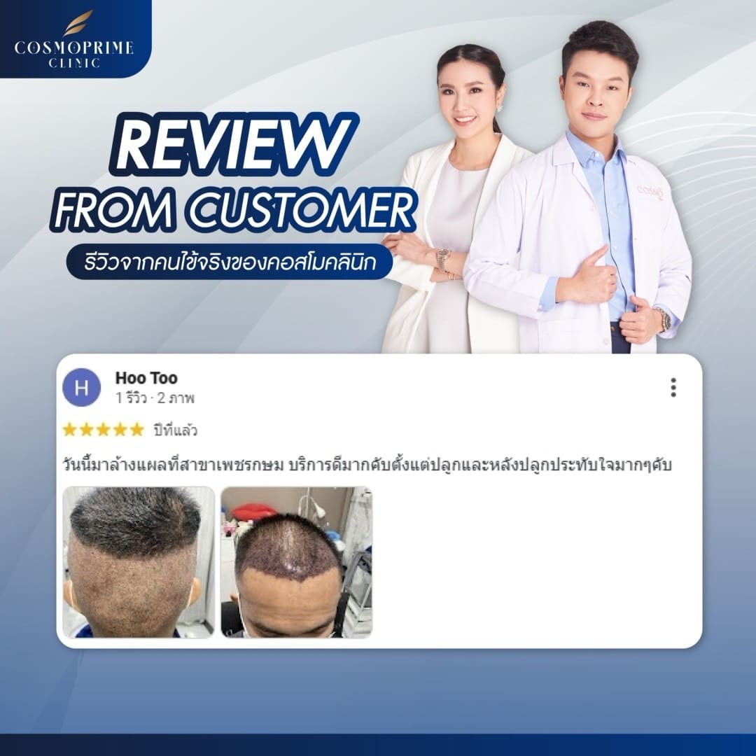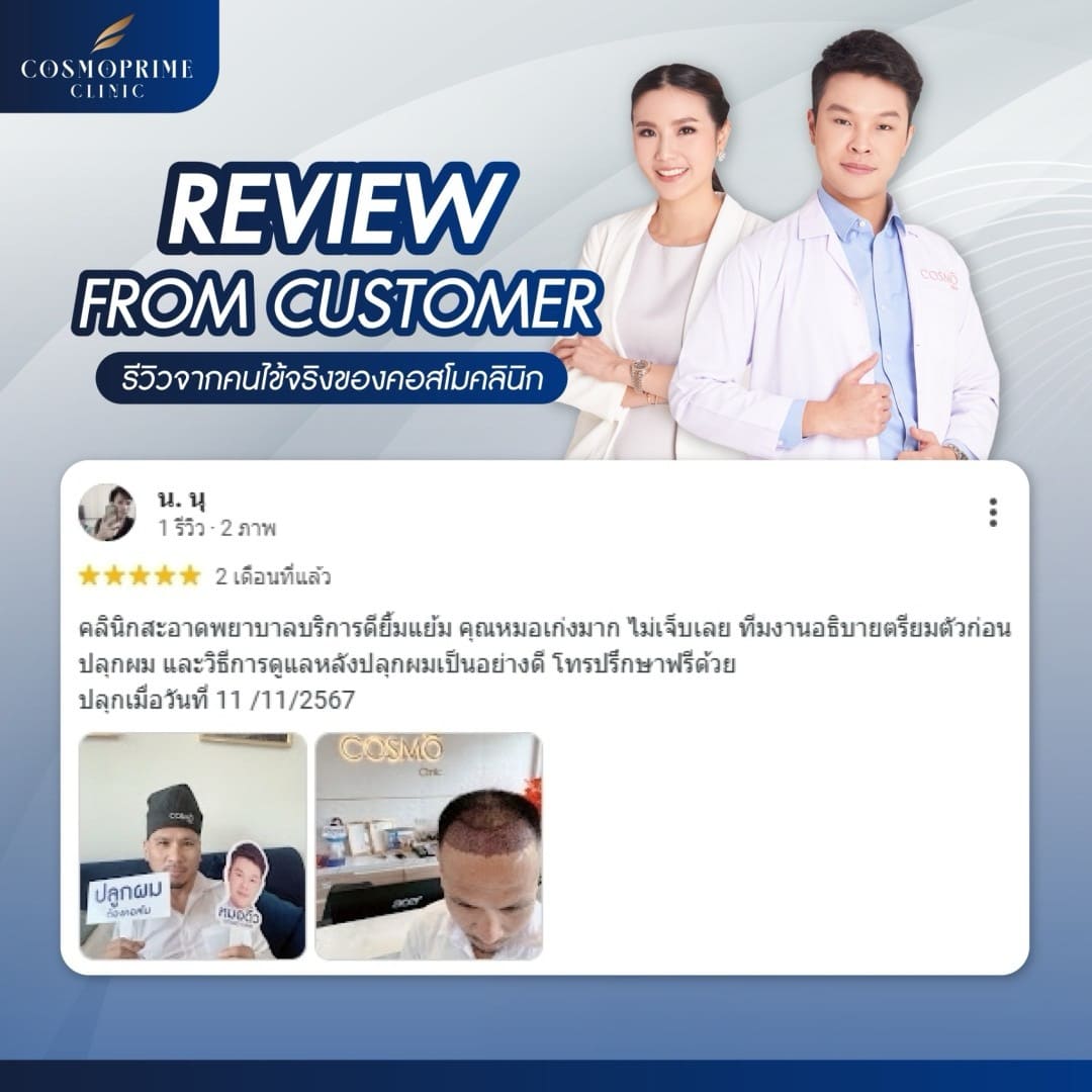 หากคุณไม่แน่ใจว่าผมร่วงของคุณอยู่ในระดับไหน Cosmoprime Clinic พร้อมให้คำแนะนำและตรวจเช็คสภาพเส้นผมของคุณโดยละเอียด หากคุณกำลังมองหาคลินิกสำหรับรักษาปัญหาผมร่วง CosmoBkk เป็นหนึ่งในทางเลือกที่ตอบโจทย์ ด้วยบริการที่ครบครันและเทคโนโลยีที่ช่วยฟื้นฟูเส้นผมโดยไม่ต้องกังวลเรื่องผลข้างเคียง