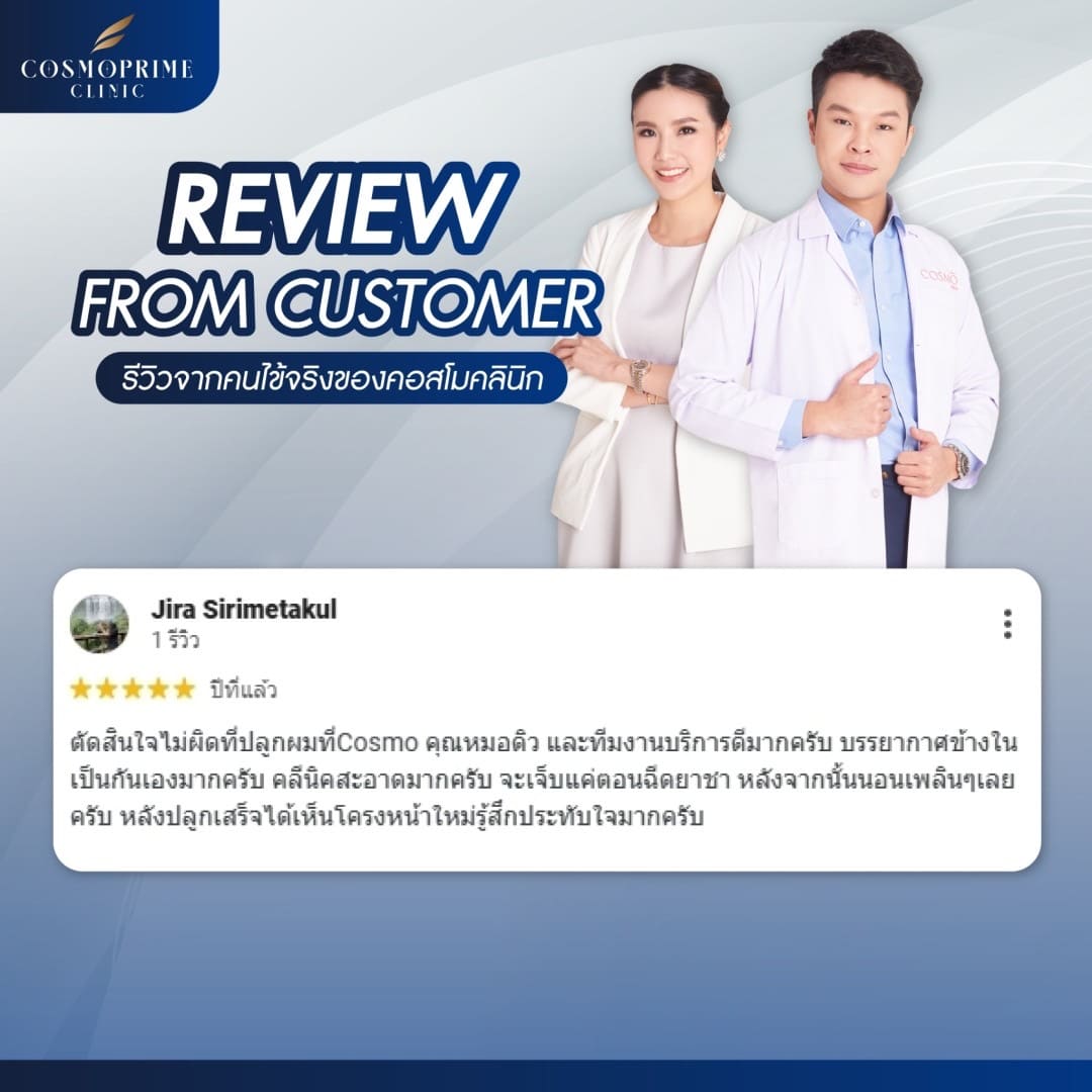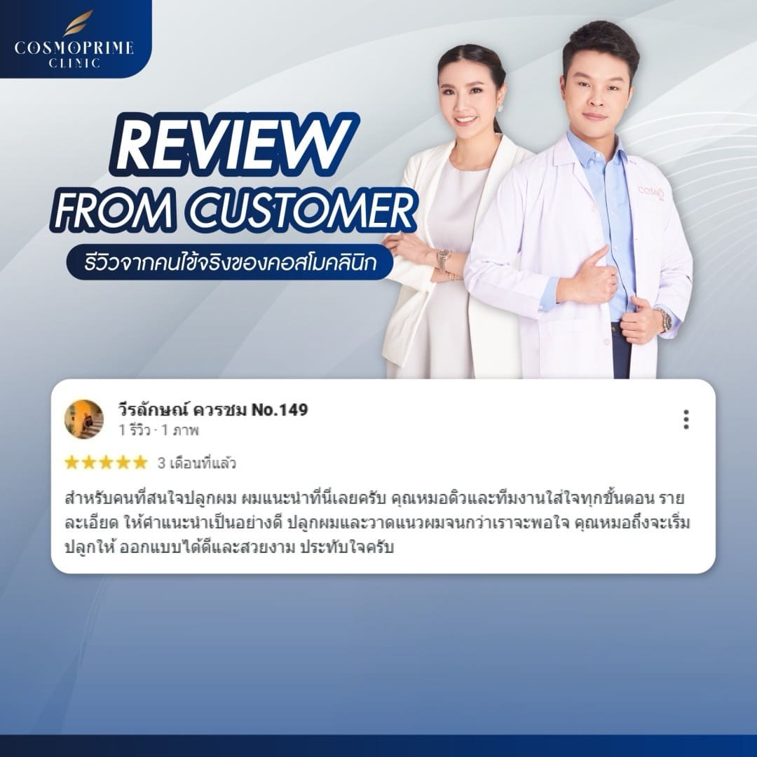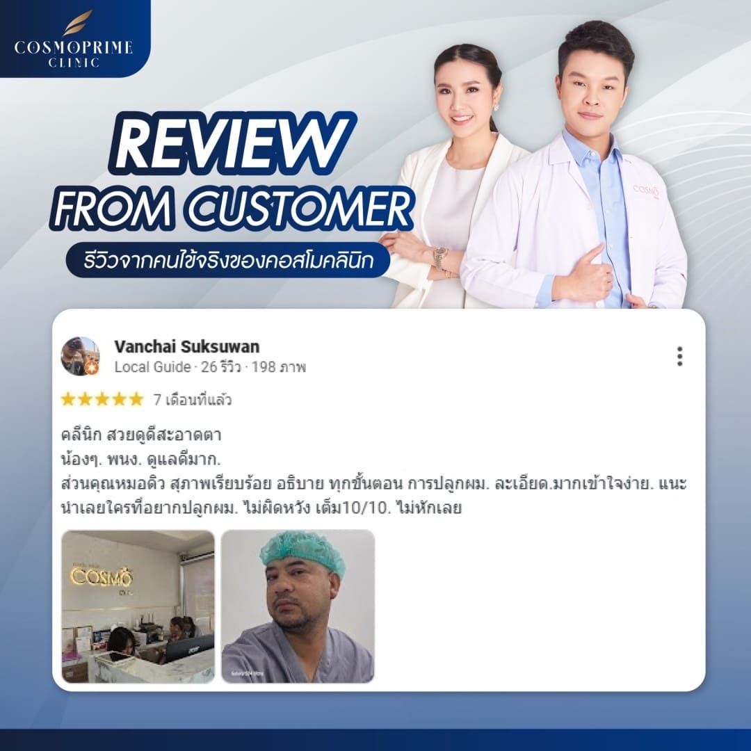 หากคุณไม่แน่ใจว่าผมร่วงของคุณอยู่ในระดับไหน Cosmoprime Clinic พร้อมให้คำแนะนำและตรวจเช็คสภาพเส้นผมของคุณโดยละเอียด หากคุณกำลังมองหาคลินิกสำหรับรักษาปัญหาผมร่วง CosmoBkk เป็นหนึ่งในทางเลือกที่ตอบโจทย์ ด้วยบริการที่ครบครันและเทคโนโลยีที่ช่วยฟื้นฟูเส้นผมโดยไม่ต้องกังวลเรื่องผลข้างเคียง